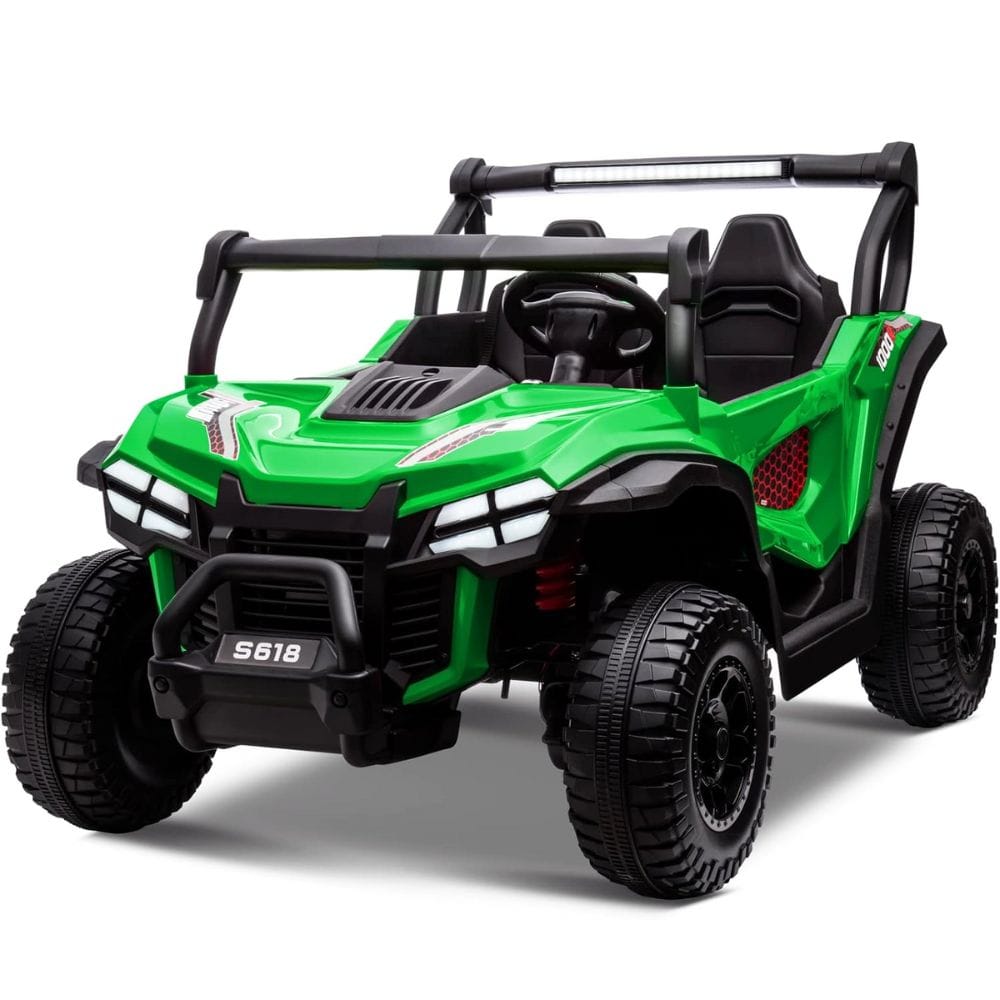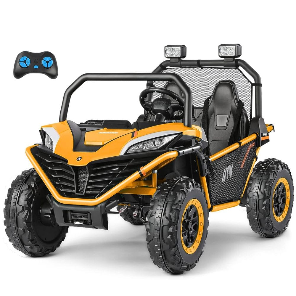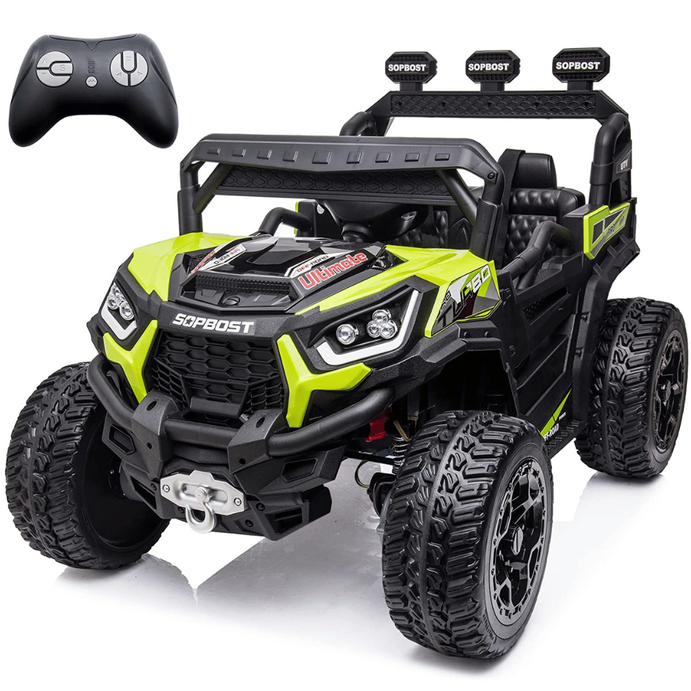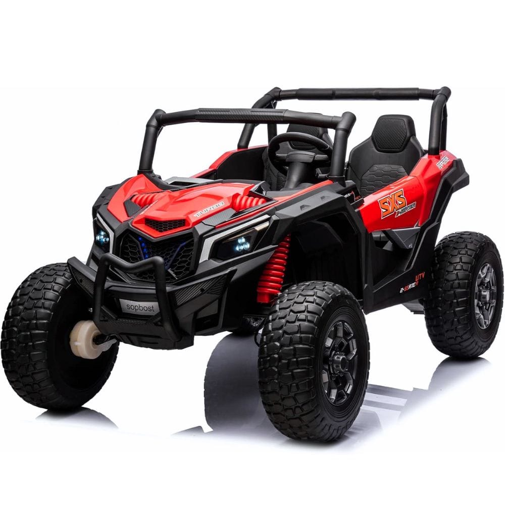 The Sopbost 24V 2 Seater Kids UTV Ride On Buggy has a cool off-road appearance, complete with bright LED headlights and a horn.