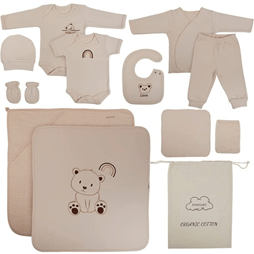 This Gift Set is the perfect choice for every parent with a new baby. Crafted with 100% pure organic cotton, this gender-neutral set will keep your little one cozy and warm in any season. The organic baby clothes set includes an infant romper, pants and top, and newborn hat, all featuring soft elastic waistbands and non-toxic nickel-free snaps. Also included is a baby hooded towel for after bath time and mittens.