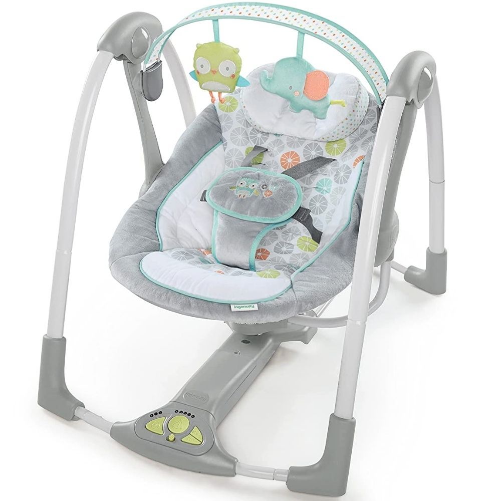 If you are looking for a portable swing that offers comfort, convenience and entertainment for your baby, check out the Ingenuity Swing 'n Go Portable Swing. This mini swing is easy to fold and carry, making it ideal for travel or small spaces. It has 5 swing speeds, 8 melodies and 3 nature sounds to soothe and stimulate a fussy baby. You can also set a timer for 30, 45 or 60 minutes and let the swing do its magic.