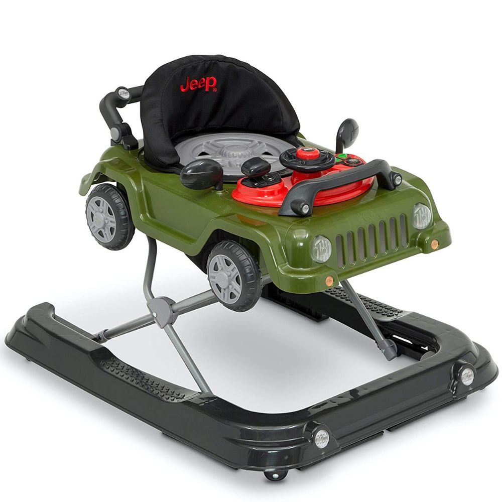 The Jeep Classic Wrangler 3-in-1 Grow With Me Walker is perfect for children up to 25 pounds and less than 30 inches tall. It has a high seat back for comfort and maximum support. Plus, this walker resembles the classic wrangler with its seven-slot grille, round headlamps, and flat fender flares.