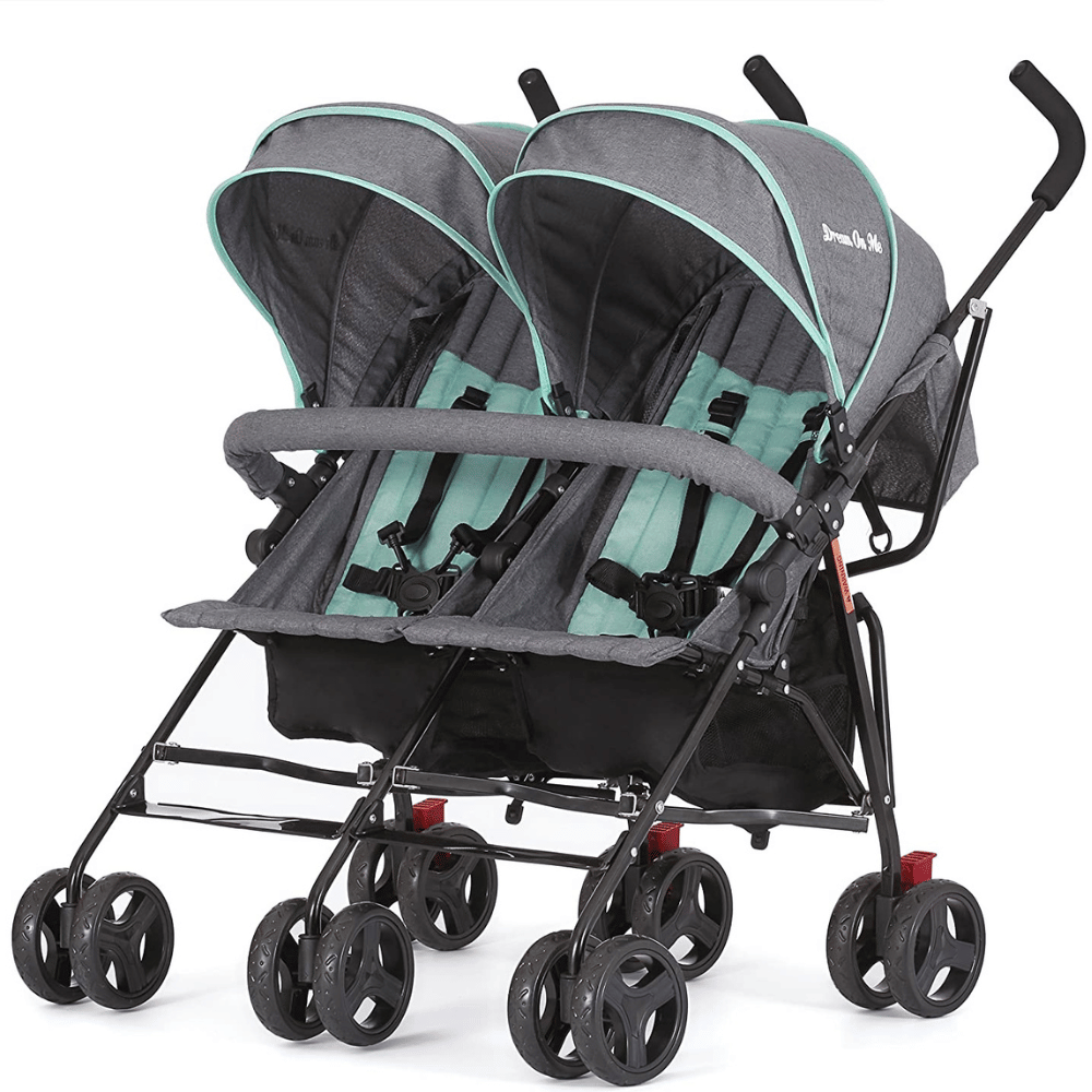 The first type is the side-by-side model. This variety has two seats positioned next to each other, so both children can see each other and interact. The downside to this style is that it takes up quite a bit of space and can be tricky to navigate through tight spaces.